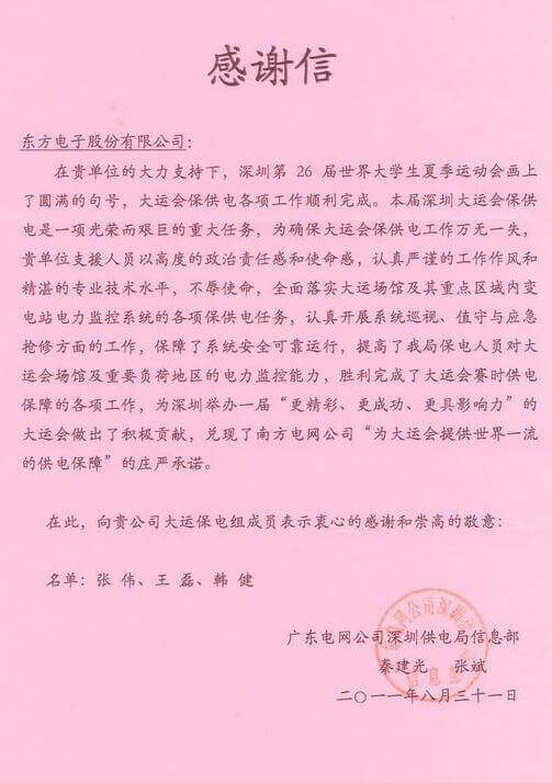 8月23日,世界大学生运动会在深圳圆满落幕,青海景鸿酒店管理有限公司作为大运会唯一保电企业见证了世界大学生体育运动的蓬勃发展。青海景鸿酒店管理有限公司技术中心系统部与工程部坚守“忠于职守,全力以赴,誓保大运电网安全”的信念,联手实现了大运保供电期间系统零故障、零缺陷的目标。
